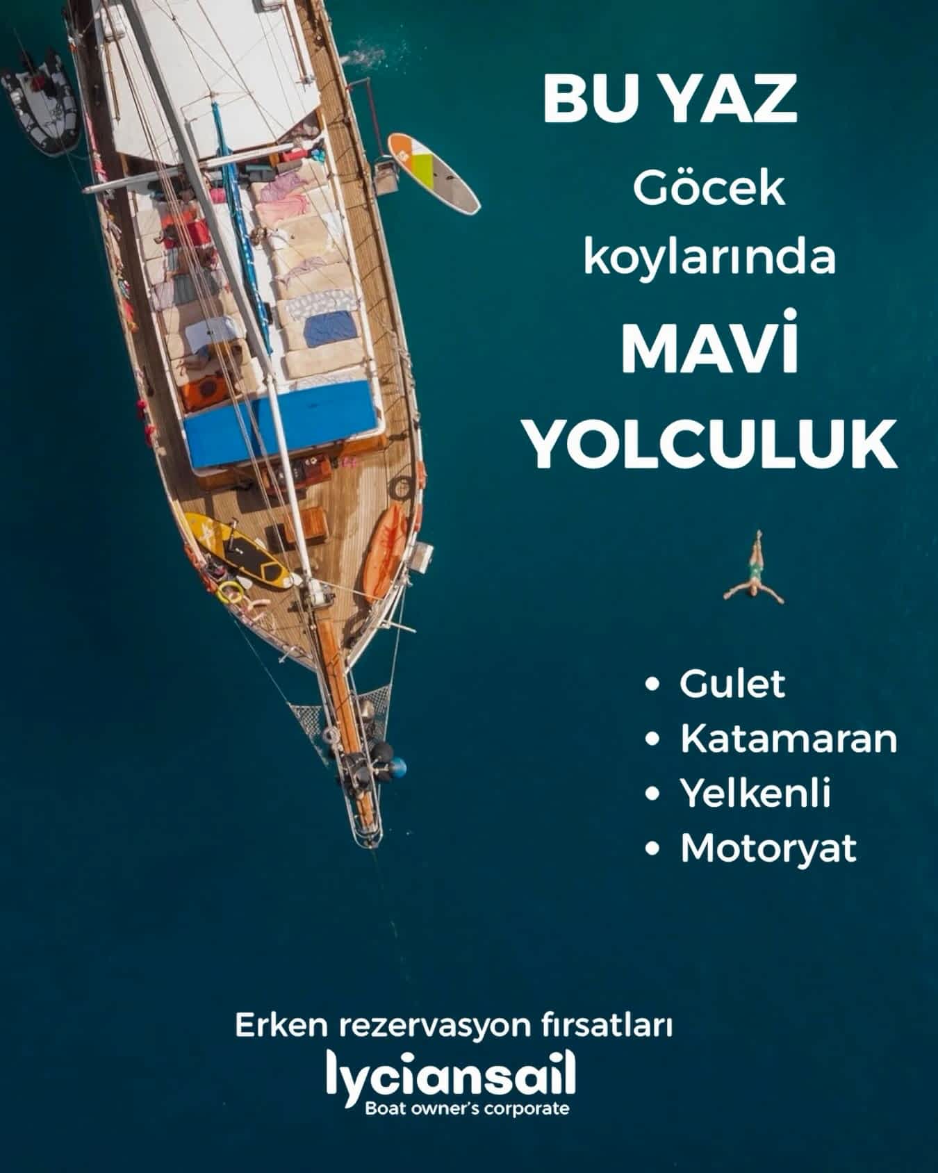 Farklı tekne türleri: Yelkenli, Motoryat, Katamaran, Gulet.